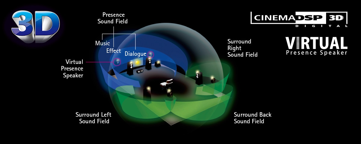 La technologie CINEMA DSP 3D offre un champ sonore riche. Le décodage audio HD permet de profiter des sources audio haute définition. L’enceinte virtuelle Presence restitue un son tridimensionnel, même sans l’utilisation d’enceintes de présence.