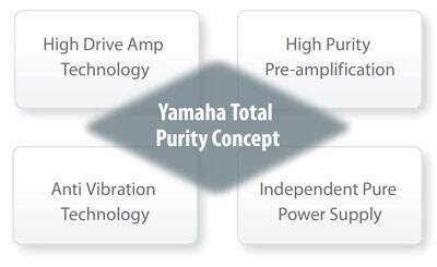Le Concept de Pureté Totale, sans cesse amélioré par Yamaha au fil des ans, comprend une technologie d'amplification puissante, des préamplificateurs transparents, une approche anti-vibration unique et des alimentations totalement indépendantes. Tous les amplificateurs Yamaha reposent sur le concept de Pureté Totale de Yamaha. Bien pensés, ils présentent des alimentations indépendantes pour les circuits analogiques et numériques permettant d’atténuer tous les bruits numériques affectant les circuits analogiques. Les dissipateurs thermiques antivibration sont conçus pour supprimer les vibrations causées par les transistors et la pression sonore. Les DAC disposent de leur propre alimentation pour contribuer également à la suppression du bruit. Dans les moindres détails, les amplificateurs Yamaha sont conçus pour atteindre la plus haute qualité sonore possible.
