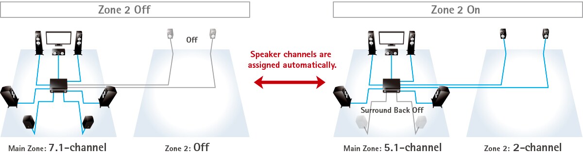 Intelligent Amp Assign permet d’assigner automatiquement les canaux d’amplification vers certaines enceintes, selon la configuration sélectionnée. Par exemple, sur un système 7.1, lorsque la zone 2 est éteinte, les 7 canaux sont utilisés dans la pièce principale. Cependant, lorsque la Zone 2 est activée, l'alimentation des Surround Back est redirigée vers les deux enceintes de la Zone 2 et la zone principale bascule alors en configuration 5 canaux. Lorsque le mode CINEMA DSP HD3 est activé, lest deux enceintes de Présence Avant sont activées en lieu et place des deux enceintes Surround Back. De la même façon, lorsque le mode CINEMA DSP HD3 est éteint, la situation est inversée. Sur un système Dolby Atmos ou DTS:X en 5.1.2, lorsque la zone 2 est éteinte, la configuration de la zone principale est bien en 5.1.2. Mais dès l'activation de la Zone 2, l'alimentation des enceintes de hauteur est déviée vers les enceintes de la Zone 2, et la zone principale bascule en configuration 5.1. Grâce à la fonction Intelligent Amp Assign, vous n’aurez plus à décâbler l’ampli. Une fois encore, Yamaha vous rend la vie plus simple.
