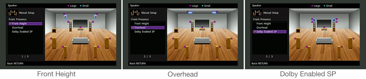 Yamaha propose de nombreux modèles de placement d'enceinte pour assurer une compatiilité parfaite avec Dolby Atmos, créant ainsi la configuration idéale pour votre installation. Tous les modèles peuvent être reproduits avec précision, que ce soit un espace tri-dimensionnel CINEMAP DSP ou Dolby Atmos.