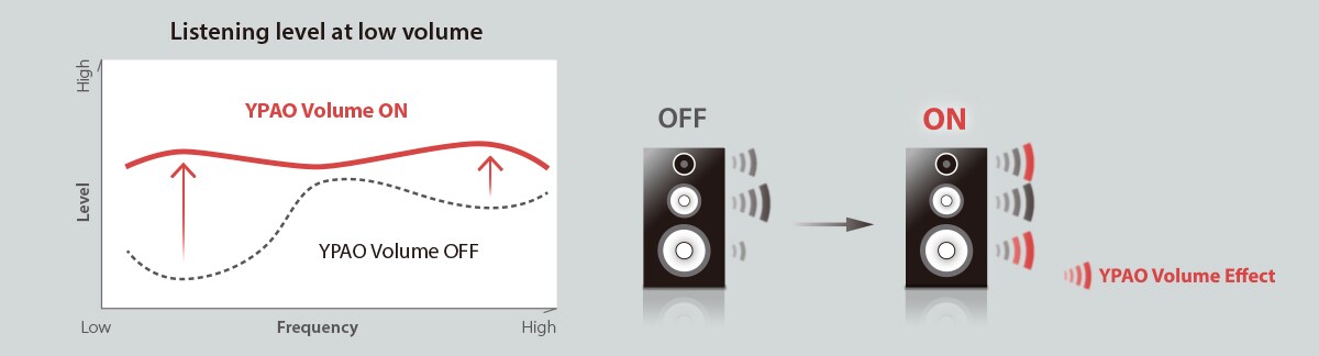 L’audition humaine est soumise à différente sensibilités selon les fréquences, et plus particulièrement lors d’écoutes à faible volume. La fonction YPAO Volume applique une correction d’égalisation du loudness pour ajuster automatiquement les niveaux des hautes et basses fréquences lors des changements de volume. Suite aux résultats de calibration YPAO, la correction d’égalisation est optimisée pour correspondre aux nouvelles conditions d’écoutes.