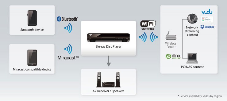 Ce lecteur Blu-ray est compatible Miracast™, standard sans fil permettant de connecter votre appareil compatible Miracast™ pour visionner photos et vidéos sur votre lecteur, pour que toute la famille profite de ce moment sur un grand écran. Lors de l'utilisation avec un amplificateur AV, profitez d'une large variété de média, affichés en miroir à l'écran avec un son dynamique.