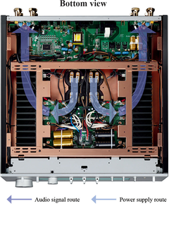Le design du circuit d’amplification dispose de blocs d’alimentation et de pré-amplification indépendants, et d’une symétrie gauche-droite parfaite. La séparation des préamplificateurs de l’alimentation réduit drastiquement les détériorations générées par les interférences mutuelles. Ce design symétrique, qui permet de conserver des étages d’amplification totalement indépendants, assure une séparation parfaite des canaux et améliore ainsi la clarté de l’image sonore.