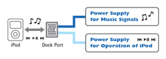 La station d’accueil iPod est dotée d’une alimentation électrique indépendante, pour éviter que le courant de fonctionnement ou de charge de l’iPod ne se mêle au signal de l’amplificateur. Cela permet d’optimiser la qualité du son provenant de l'iPod.