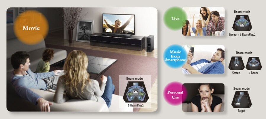 Le système YSP-2500 propose six modes Beam (Faisceau), convenant différemment selon la source en cours de lecture. Ces modes comprennent ""5 Beam+2"" pour une reproduction surround 7.1 fidèle, ""3 Beam"" parfait pour les larges zones d'écoute, ou ""Stereo + 3 Beam"" idéal pour les films concerts. En utilisant l'appli HOME THEATER CONTROLLER, il est possible d'ajuster graphiquement l'angle et le volume de chaque faisceau selon ses préférences.