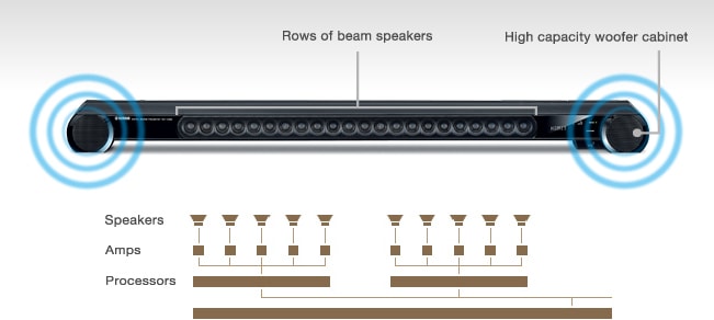The front surface of a YSP unit features a number of compact beam speakers* installed in orderly rows. Control of each of these speakers on a time axis by individual amps creates five sound beams. Bouncing these sound beams off walls creates a surround environment.