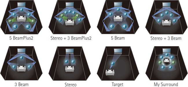 Le YSP-4300 délivre un véritable son surround en orientant les différents faisceaux via différents angles. Le mode principal est le 5 BeamPlus2 pour les sources 7 canaux. Sont également présents plusieurs autres modes d’écoute. Vous pouvez sélectionner 3 BeamPlus2 + Stereo, 5 Beam,Stereo + 3 Beam, 3 Beam, Stereo, Target et My Surround.