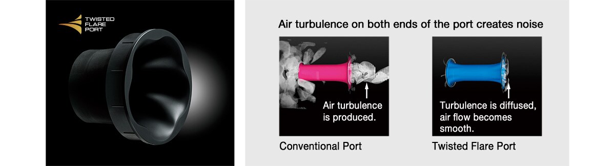 Le tout nouvel évent en forme de spirale profite de la grande expérience de Yamaha dans le développement de caissons de basses. Cet évent spécial diffuse le vortex d'air généré aux bords de la sortie, pour un débit constant. Cette technologie permet de réduire les sons superflus non-présents dans le signal d'entrée original pour un son clair et une reproduction fidèle des basses fréquences. Des effets spéciaux de films aux atmosphères des concerts live, vous ressentirez des basses réalistes, claires et précises.