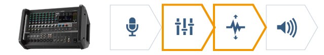 This type of mixer includes a built-in power amplifier. Since the mixer and power amplifier which require a power supply are integrated into the PA system, only one power supply connection is required, and there are less connections to make than with stand-alone amplifiers.