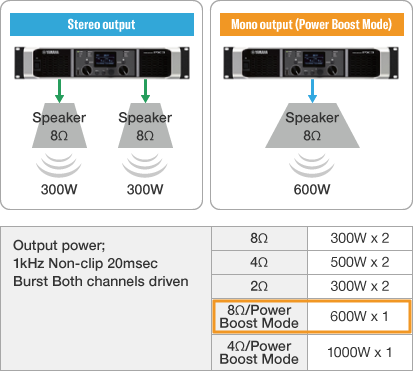 Almost all stand-alone power amplifiers feature stereo specs. However, if an amplifier is connected in bridged (BTL: Balanced Transformer Less) mode, it can be used as a single monaural amplifier. The output wattage will change in this mode. Yamaha PX series power amplifiers are featured Power Boost Mode instead of BTL mode.