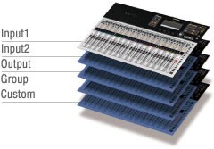 Deux banques INPUT et une banque OUTPUT sont disponibles, et la banque GROUP est accessible e, appuyant simultanément sur les deux touches de banques INPUT. La banque GROUP permet de contrôler les niveaux de plusieurs voies depuis un seul fader DCA. Quant à la banque de faders CUSTOM, elle permet d’assigner n’importe quelle entrée, sortie ou groupe de DCA à n’importe quel fader.