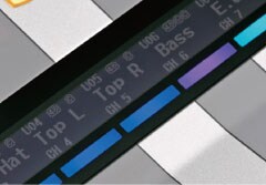 Un afficheur situé au-dessus de chaque fader de voie visualise le nom ou l’ID assigné à chaque voie, le nom du port, et la position actuelle du fader. Le statut de l’alimentation fantôme, ainsi que du noise et du compresseur, peuvent aussi être visualisés. Une barre colorée indiquant la couleur assignée à la voie facilite la navigation et évite toute confusion lorsque vous changez de banque de faders ou rappelez des Scènes.