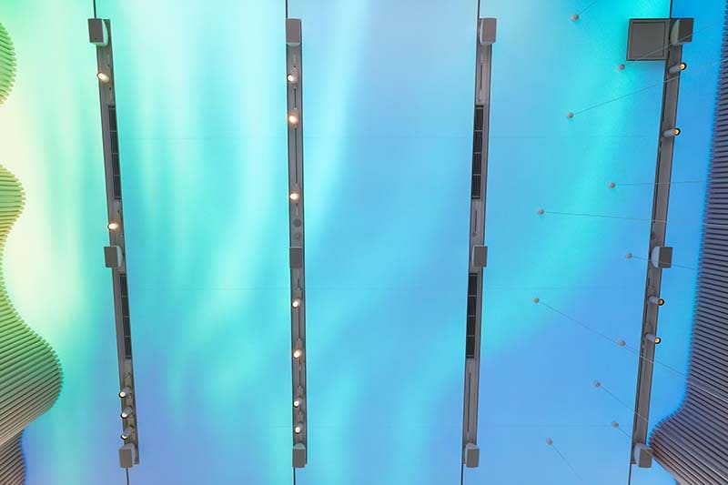 Spotify, also a Swedish company, provides the music streaming service with a dedicated Volvo Studio playlist. The background music is linked to the sky video playing on the ceiling display panel.