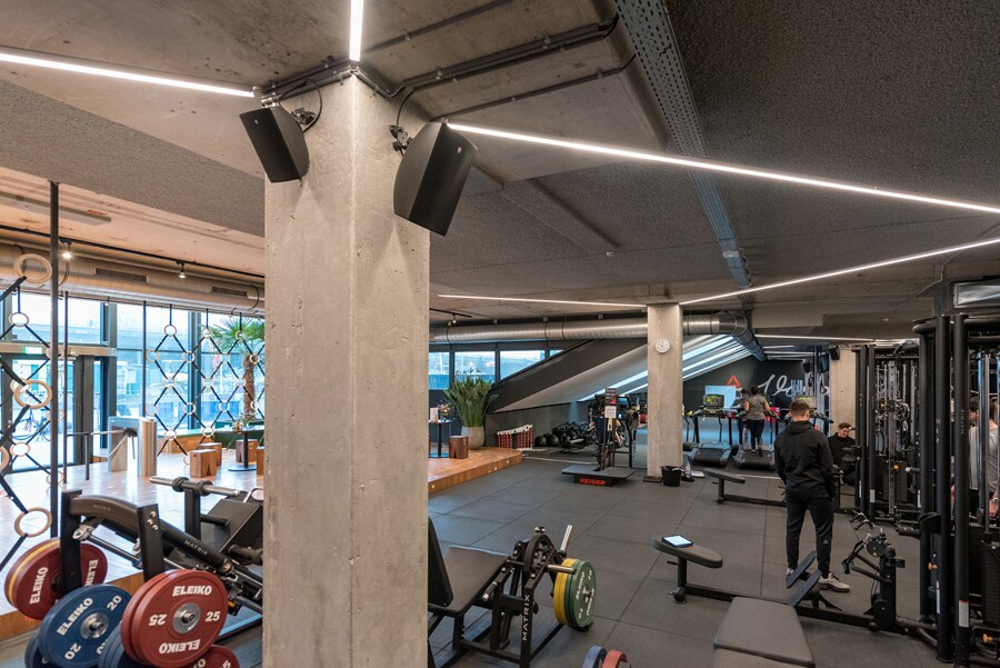 The Yamaha system delivers high quality sound at a fairly low level during the day, which is increased in the evening when the offices above close and many employees move from their desks down to the fitness facilities.