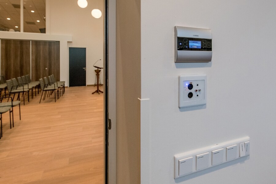 The system is set up as five zones, one for each area, with additional zones for assisted hearing loops in the church and Rooms 1/2. System control is by four MCP1 wall-mounted panels, one in each indoor area. Each MCP1 has local, panel-mounted XLR and RCA inputs nearby.