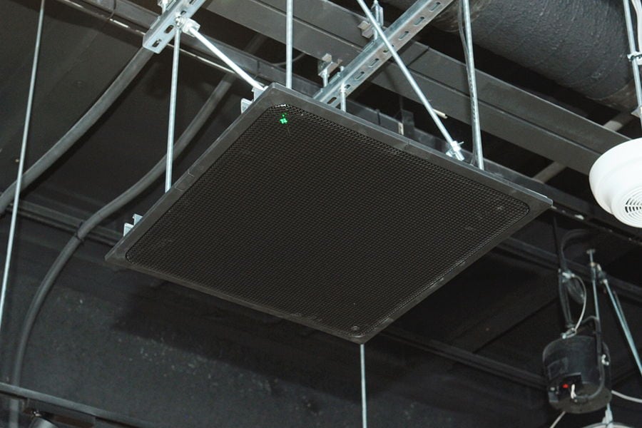 • Enlarged ceiling detail of photo at left: RM-CGB ceiling microphone suspended from skeleton ceiling with wire
