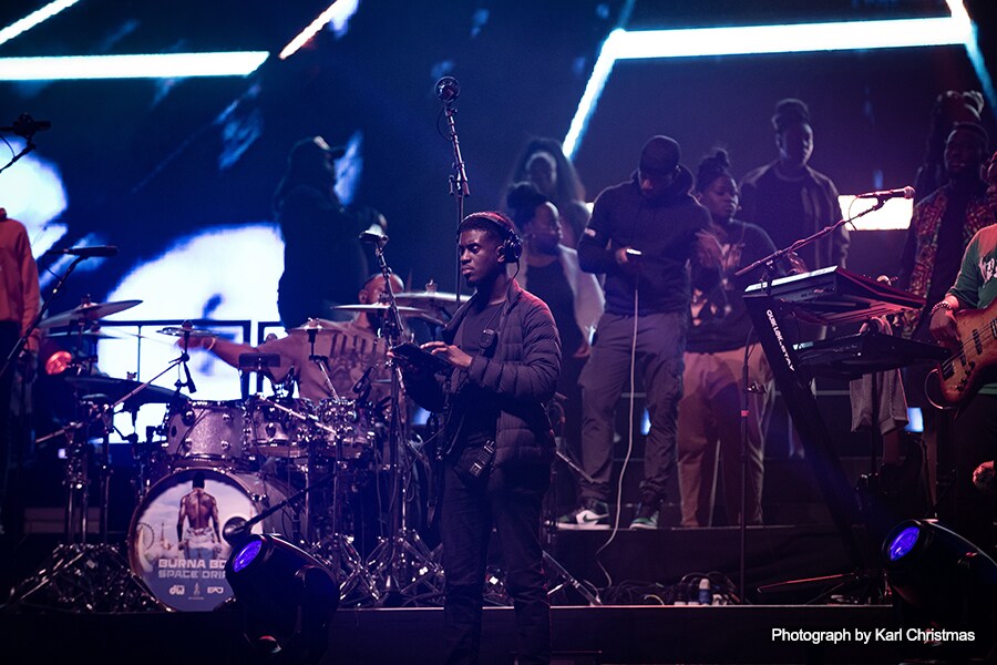 With music blending Afrobeats, dancehall riddims, reggae, American rap and R&B, the large production included a 16-strong choir using headset microphones, a string quartet, brass section, traditional percussion, guitar, keyboards, bass, drums and guest vocals.
