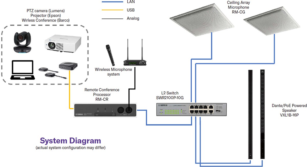 All the ADECIA devices in each system were connected to a Yamaha SWR2100P-5G L2 network switch, routing both Power over Ethernet (PoE) and audio over a single Cat 6 cable.