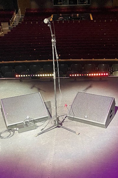 “We didn’t have room for big wedges (the industry term for angled floor speakers),” he explains, gesturing toward a DHR12M now scuffed from fast resets and location changes. “These gave us tight, focused sound without cluttering the stage or interfering with shots. They just worked—every single time.”
