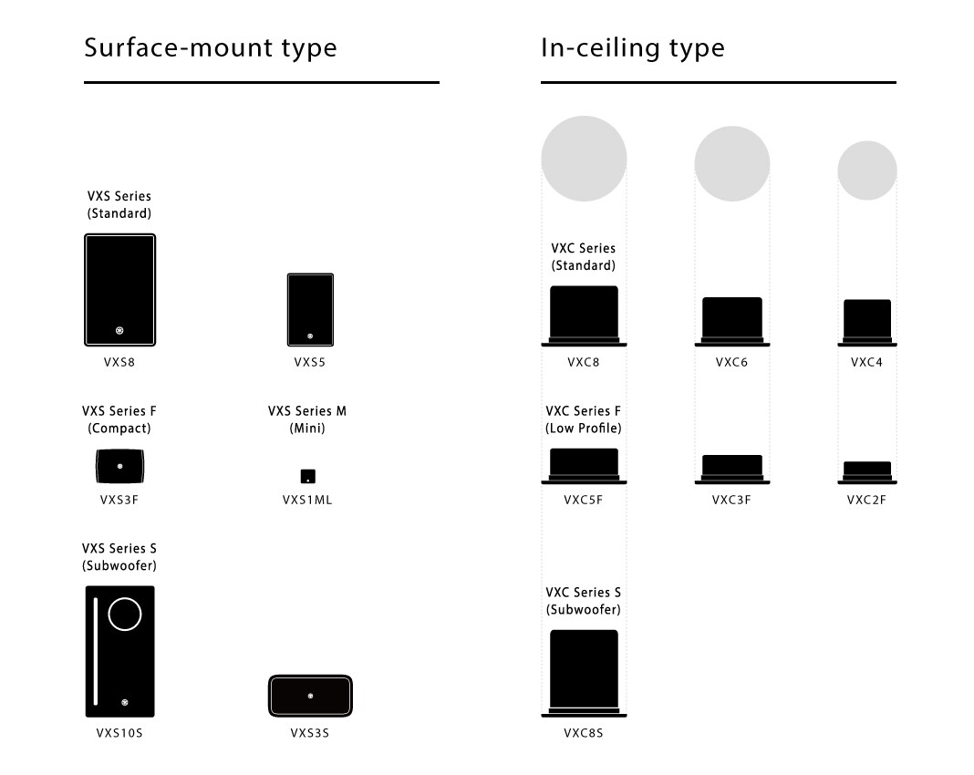 Haut-parleurs de plafondLa série VXS "modèles S" regroupe des caissons de basses qui complètent parfaitement le son naturellement expressif des enceintes des séries VXS et VXC.