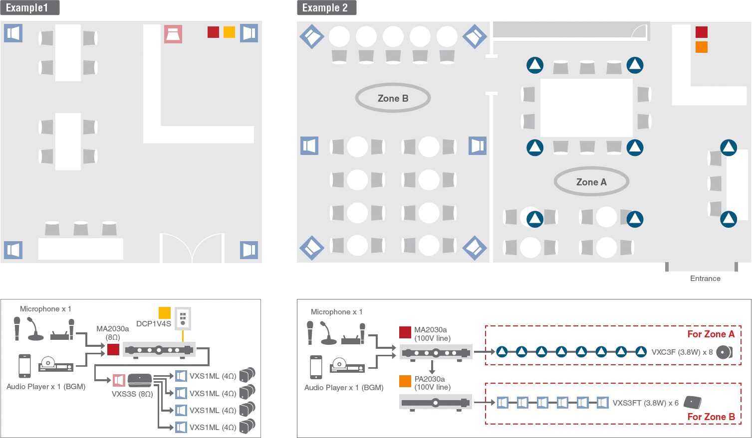 Here’s an ideal solution for a small café or restaurant that we recommend for customers in this type of situation. In order to create a comfortable, agreeable environment of this sort, attention should be paid to both sonic and visual quality. Compact speakers like the VXS1ML and VXS3F can be mounted on walls or ceiling, adding a touch of class to any décor with their uniquely refined form. They have also been specially tuned to deliver full musical nuance and impact even at low volume and thereby eliciting the greatest atmospheric contribution from the music used. The MA2030a is a stylish mixer amplifier that can be easily used without any prior audio experience. All you need to get started is the MA2030a, VXS series speakers, and a music source of your choosing. You can add a microphone for announcements and small events if necessary, easily broadening the scope of your business. Refer to Example 1. You can increase the number of speakers the system is capable of driving by adding a PA2030a power amplifier to cover a larger or more complex area. In a larger speaker system of this sort it becomes possible to add VXS3FT models and in-ceiling VXC3F models as appropriate to location and décor. Refer to Example 2.