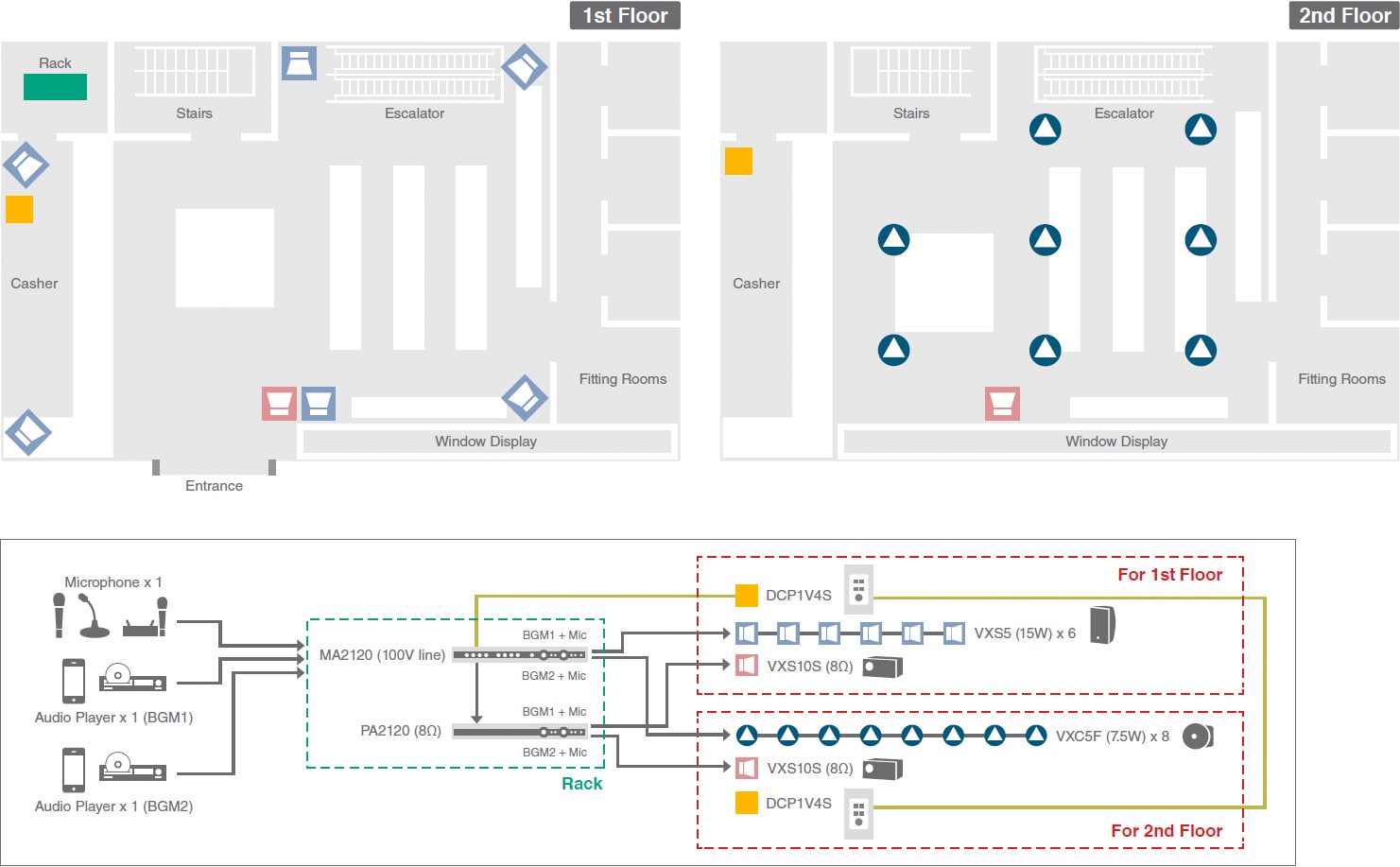 This system would be a good choice for a multi-level boutique or a restaurant that features a bar or lounge. Background music is just as important as décor and lighting for creating a specific mood. Yamaha VXS and VXC series speakers provide high quality playback that delivers the full emotional impact of the music to the listening area, making a major contribution to overall atmosphere. The power and excitement of rhythmic music can be enhanced by adding VXS10S subwoofers. The MA2120 would be a good choice for broadcasting announcements or advertisements while supplying different background music to different areas. It includes a Ducker function that automatically reduces the volume of the background music while a microphone is being used so that no manual adjustments are required. DCP1V4S control panels installed in the separate areas allow remote control of background music volume and other operations.