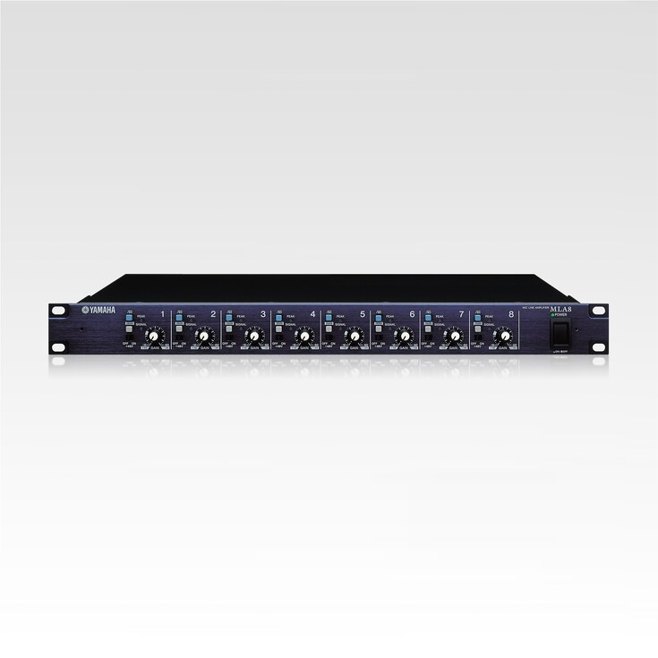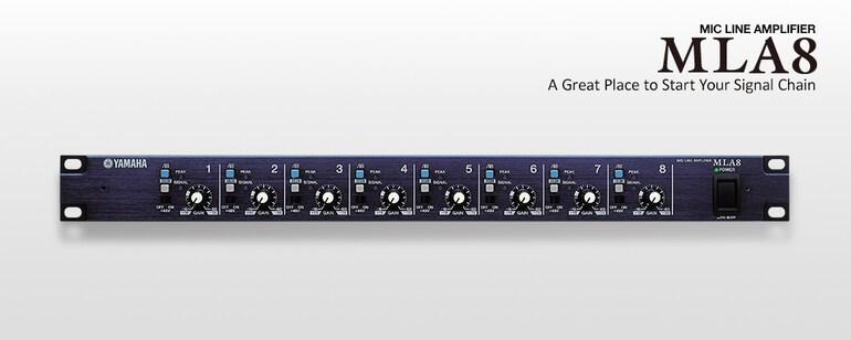 Le MLA8 est un préampli micro à huit canaux ayant hérité de la technologie de pointe des préamplis micro de la console de mixage numérique DM2000 hautement acclaméede Yamaha. Le MLA8 rassemble dans une unité 1U compacte un pad de 26 dB, un trim de gain de 44 dB réglable, un filtre passe-haut de 80 Hz et un commutateur d'alimentation fantôme sur chaque canal. Deux bornes Euroblock et un connecteur D-sub à 25 broches sont présents sur le panneau arrière pour les connexions de sortie, faisant ainsi du MLA8 un complément parfait des mixeurs numériques Yamaha.