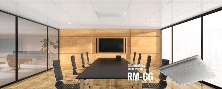 RM-CG est un ensemble de microphones de plafond équipé de quatre faisceaux à suivi automatique capables de suivre la prise de parole simultanée de plusieurs locuteurs. Comme ces faisceaux détectent et suivent la direction de la source sonore simplement lorsque le locuteur parle, il n'est pas nécessaire de régler à l'avance la position ou la portée de la captation sonore.