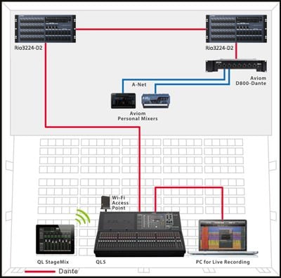 Voici un exemple de système live relativement simple, utilisant un réseau audio Dante. Sur le côté de la scène, des racks d'entrée/sortie de la Série R sont connectés à la console QL de façade via des câbles réseau. Un système d'écoute personnelle Aviom peut aussi être connecté au réseau, via un distributeur Aviom D800-Dante. Cette configuration autorise même l'enregistrement multipiste sur ordinateur via le réseau Dante.