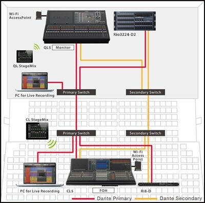 Ce système de sonorisation live compact mais polyvalent et puissant utilise une console de la Série CL en façade, tandis qu'une console QL sert à la fois pour le mixage de retours et les connexions d'entrée/sortie, grâce à sa fonction Port to Port. La fonction Gain Compensation signifie que le gain des préamplificateurs se contrôle en toute sécurité depuis l'une ou l'autre console, sans interférence. Pour une fiabilité système maximale, le système utilise une configuration réseau en étoile, avec des switches réseau : un éventuel problème dans une partie du réseau n'interrompra pas la circulation globale des signaux. L'enregistrement live vers plusieurs ordinateurs est également possible.