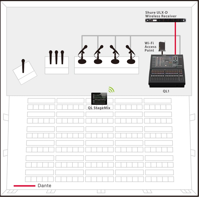 Le système de sonorisation intègre, en façade, une console CL et, en retours sur le côté de la scène, une console QL, que sa fonction Port to Port permet d'utiliser comme boîtier d'entrée/sortie, avec des possibilités comparables à celles d'un rack de la Série R, ce qui réduit la taille et la complexité globales du système.