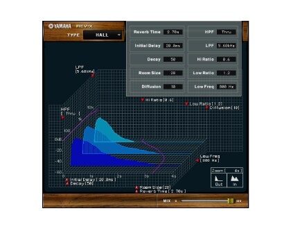 REV-X est un algorithme de réverbération assurant un son réverbéré riche et d’une grande densité, avec une retombée progressive, une dispersion et une profondeur qui améliorent considérablement le son original. Vous pouvez choisir parmi trois programmes selon l’environnement et votre démarche créative : REV-X Hall, REV-X Room et REV-X Plate.