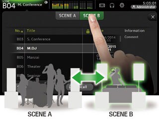 Les mémoires de scènes sont réparties dans deux banques, A et B, contenant chacune jusqu’à 100 scènes. L’utilisateur dispose donc d’un total de 200 scènes configurables à volonté et rappelable instantanément dès que nécessaire. Il existe un certain nombre de scènes pré-programmées, conçues pour donner une base à l’utilisateur : des scènes utilisant les encodeurs 1-Knob COMP et 1-Knob EQ, pour faciliter l’utilisation au maximum, ou des Scènes désactivant les encodeurs 1-Knob, pour les ingénieurs expérimentés voulant se conformer à une procédure établie. Ces deux banques permettent de classer facilement les différents types de scènes : l’une classée par style musical et l’autre par type de prestation, par exemple.