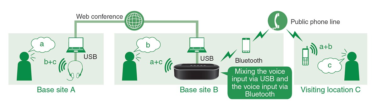 La fonction de mixage audio mélange plusieurs sources d’entrée vocale connectées à chaque interface (USB, Bluetooth et entrée/sortie audio) permettant une communication simultanée sur différentes lignes. Par exemple, lorsque vous êtes connecté à une conférence Web par USB, vous pouvez inclure davantage de participants via un smartphone par le biais d’une connexion Bluetooth avec la fonction de mixage audio pour combiner les sources audio.
