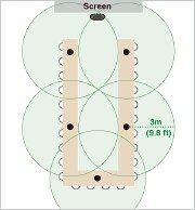 Pour les configurations « à 3 microphones » et « à 5 microphones » illustrées ci-dessus, la qualité audio est supérieure dans la configuration « à 5 microphones » car les microphones sont placés plus près des participants.