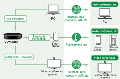 Connectez-vous au YVC-1000MS par USB, Bluetooth*1 ou aux terminaux audio*2 d’un système de conférence pour bénéficier d’un son de haute qualité lors de vos conférences et réunions. Cette gamme d’options de connexion vous permet de vous adapter rapidement à de nombreux environnements de communication, ainsi qu’aux situations où la conférence pourrait être difficile en raison de l’absence de ligne fixe ou de problèmes de connectivité Internet.