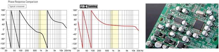 Les modèles large bande utilisent un filtre numérique de type FIR-X tuning™ qui, grâce au filtre à phase linéaire FIR, optimise la réponse en phase à la fréquence de raccordement des transducteurs de grave LF et d’aigus HF. Le résultat est évident et procure une précision et une douceur impossible à obtenir avec des filtres conventionnels. Les signaux sont traités par des DSP travaillant en 48 bits (accumulateur sur 76 bits). La conversion A/N et N/A est effectuée en 24 bits par des composants de haute précision, de rapport signal/bruit et de dynamique supérieure.