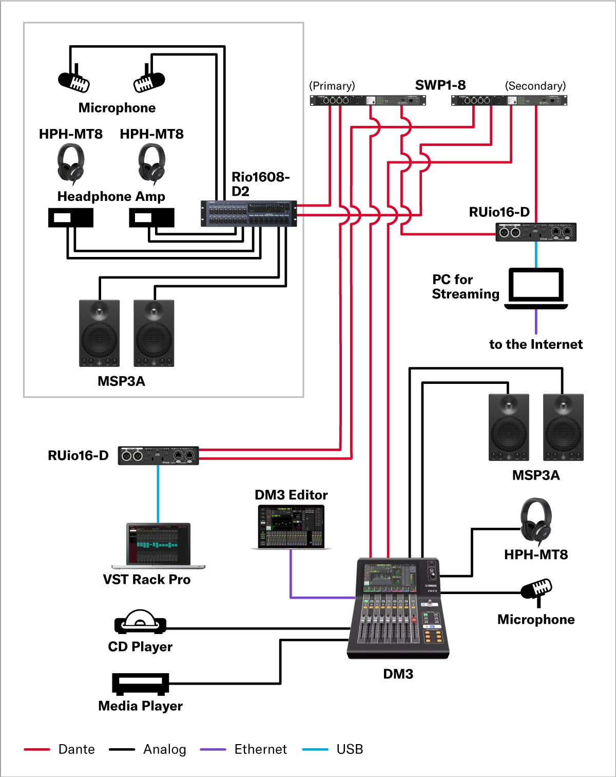 This is a system for recording and broadcasting live performances in a network studio. The DM7 Compact is compact but capable of mixing 72 channels. The optional Broadcast Package software allows you to use Mix Minus functionality, and to monitor with a loudness meter.