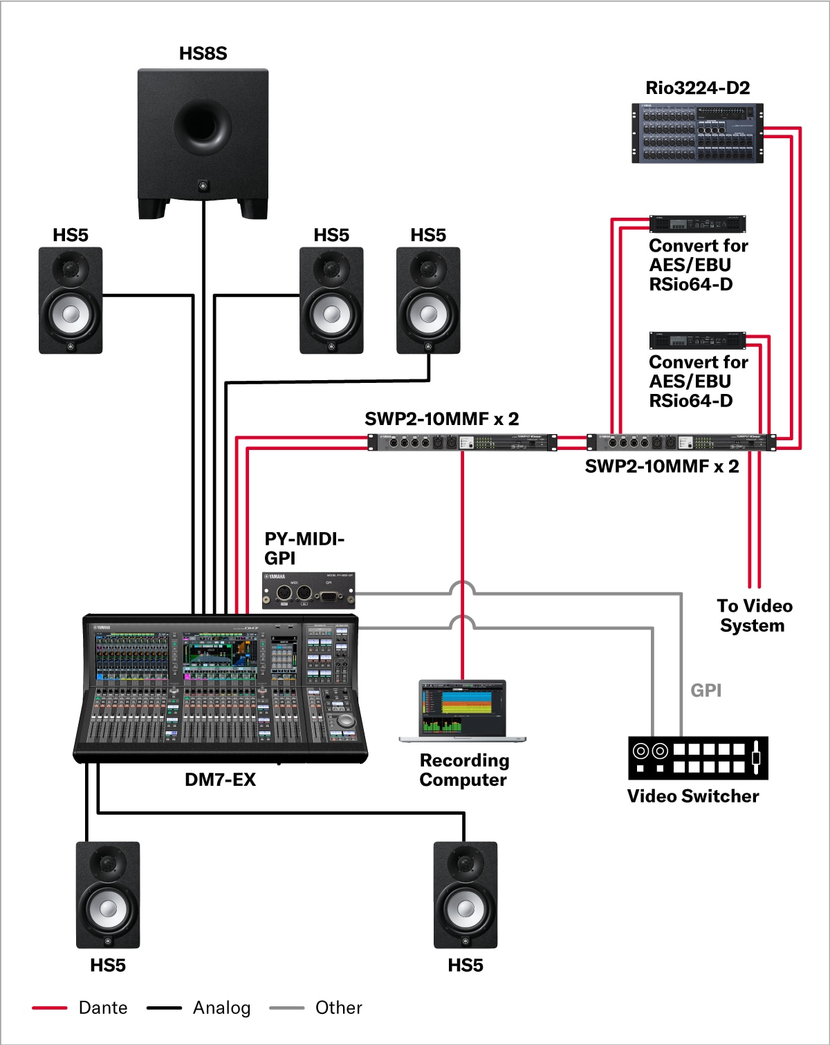 The wide range of controls and Broadcast Package on the compact size of DM7 provide audio mixing capabilities with a variety of functions, including 5.1 Surround mixing, monitor control, and an Audio Follow Video function that ties audio to video by following tally signals via GPI. Enjoy flexible connectivity through conversion to different formats enabled by a Dante backbone network.