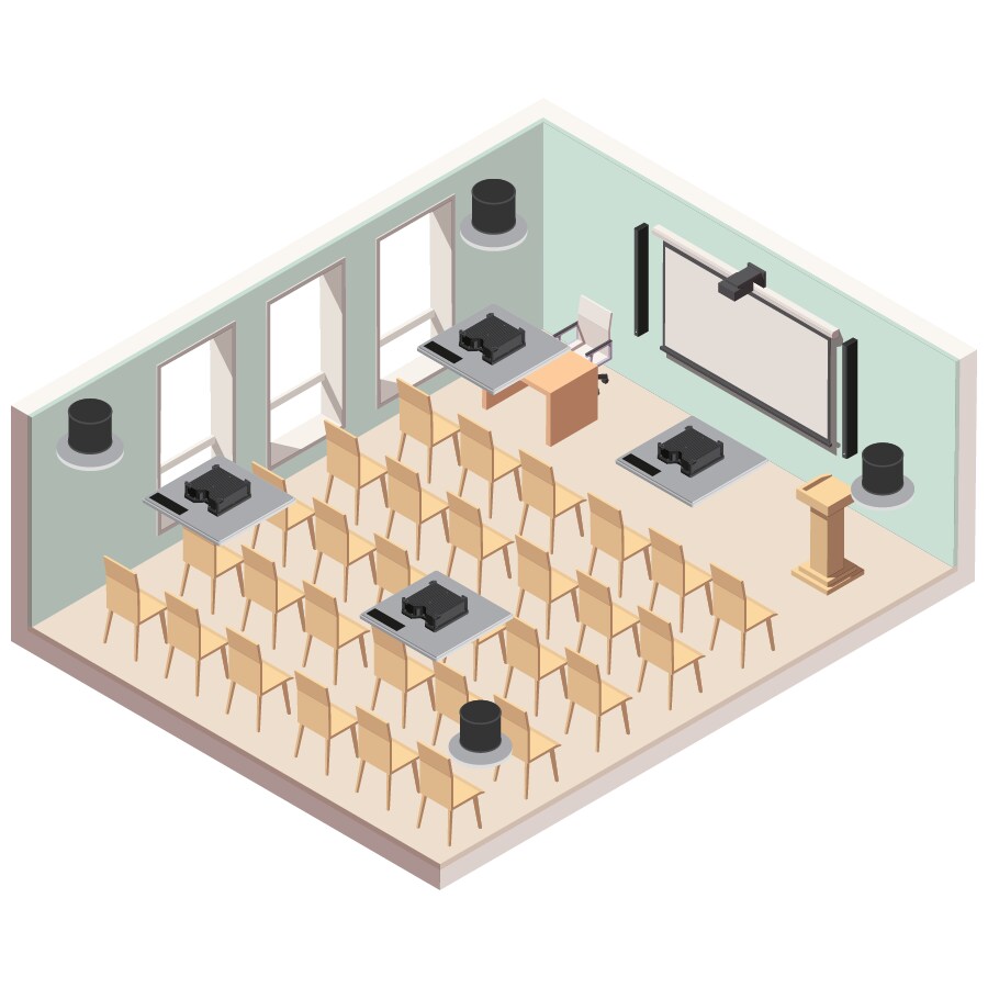 The ceiling array microphone RM-CG quickly and reliably detects presenters in the room and captures their voices, with a refined focus on intelligibility. Remote participants’ voices are projected clearly through VXL column loudspeakers. The ADECIA solution allows easy integration with many third party camera and collaboration solutions.