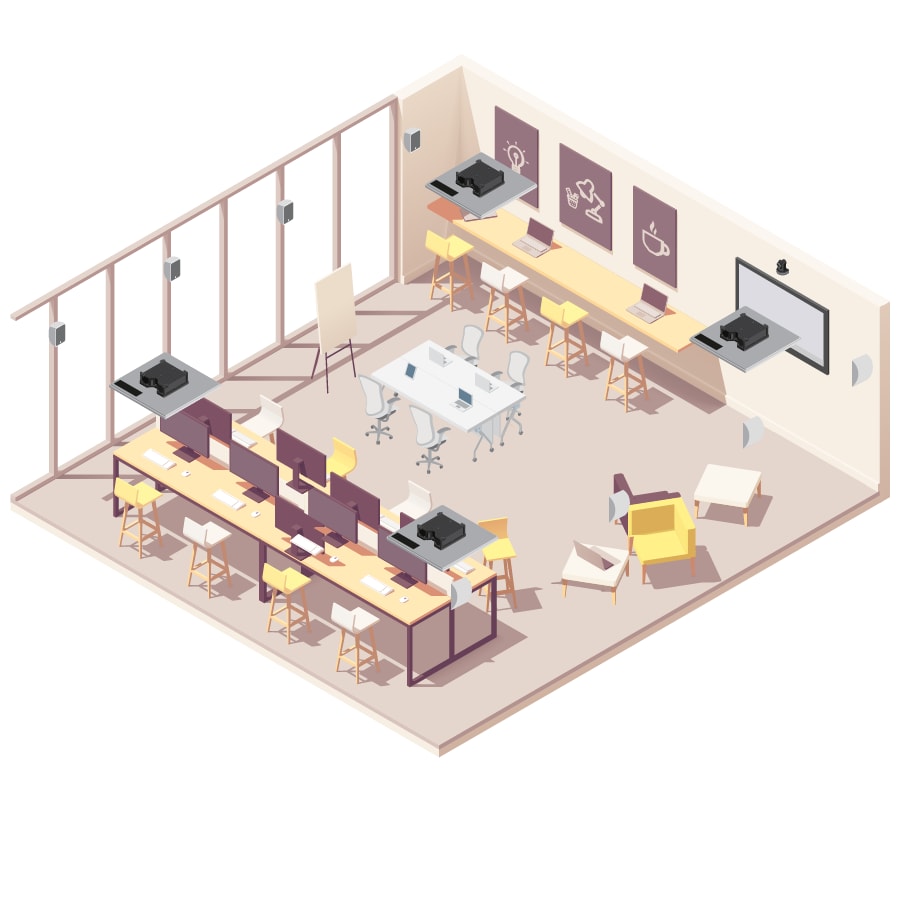 If you want to divide a conference room into multiple separate rooms, Yamaha have technologies to help you achieve your goals. By using suitable processing devices, the room can be freely divided or integrated without complicated operation. This allows you to adapt the system as the layout changes. We also collaborate with many other manufacturers to allow you to choose the audio and video combination for your space.