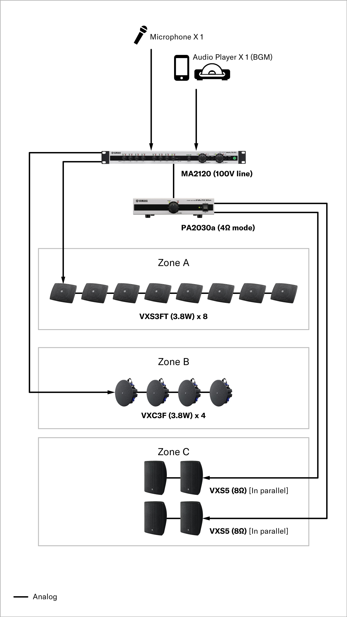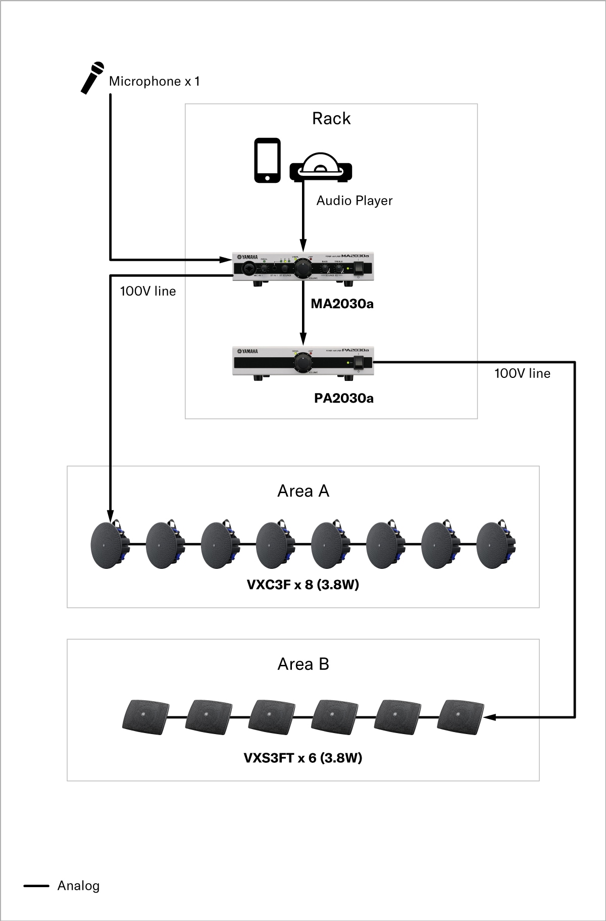 For spaces that can be divided into two zones, separate volume settings can be adjusted for each zone by disabling the volume syncing function between the MA2030a power amplifier and the PA2030a expansion amplifier. This allows customers to listen to background music at an ideal volume both in quiet environments, and spaces with more ambient noise such as a terrace.