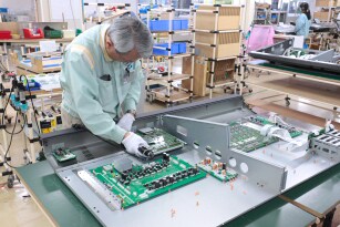 Yamaha employs a cell-production system at the Toyooka factory for final assembly rather than the more traditional assembly line approach. Assembly and basic inspection for each product takes place entirely with a single "cell," which is manned by anywhere from one to about ten workers, depending on the complexity of the product. This approach offers a number of advantages. Once a traditional assembly line is set up it is very difficult to modify, and it will occupy the same amount of factory space regardless of the production volume. Production cells, on the other hand, can be dynamically adjusted and rearranged to meet production needs. Production can be interrupted at any time to allow improvements in the process, such as the implementation of different tools or jigs. In many cases the cell workers design and construct their own jigs to suit the task at hand. In fact, cell workers at Yamaha factories are true specialists in the sense that they have extensive knowledge of the product they are working on, and take responsibility and pride in a large portion of its production. When assembly is complete, each and every unit produced undergoes a thorough final inspection right in the cell, so if a problem is detected it can be rectified immediately and effectively.