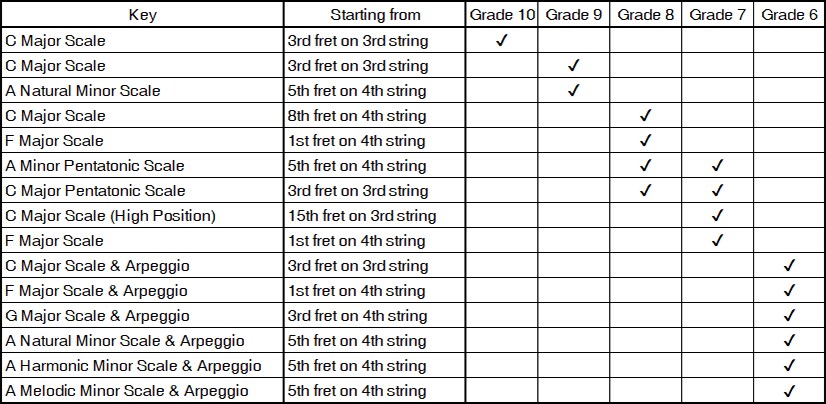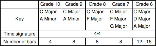 Candidates play one (Grades 10, 9), two (Grades 8-6) scales selected by the examiners without the use of a score.