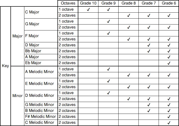 Candidates play one (Grade 10), two (Grades 9 - 6) scale(s) selected by the examiners without the use of a score.