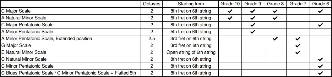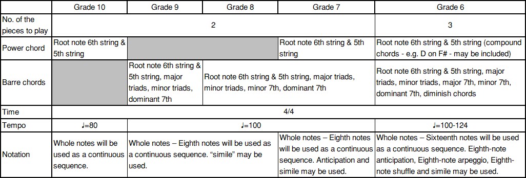 Candidates are expected to bring the instrument and equipment needed for the exam. (An amplifier and a lead will be prepared in the exam room.)