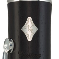 Clarinette La, série Custom, système Boehm, 19 clés, 6 anneaux, levier de Mib, support de pouce réglable avec anneau pour accrocher une cordelière, baril 65 mm, corps en grenadille, clétage en maillechort, finition argentée, ligature argentée et couvre bec en résine ABS.