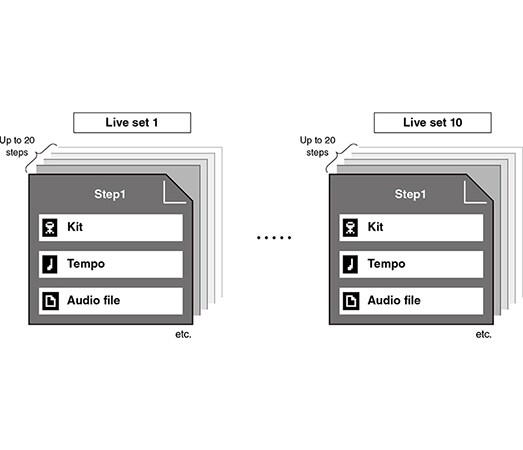 Le DTX-PROX est équipé d'une fonction "Live Set" qui vous permet d'arranger et de définir librement diverses combinaisons de kits, de tempos et de fichiers audio ou de pistes d'accompagnement, et de les rappeler d'une seule touche, ce qui le rend particulièrement utile pour les salles de spectacle ou pour les événements de diffusion en direct. Il permet également diverses configurations, notamment la fonction Wav & Click Sync qui ajoute des paramètres de clics aux fichiers audio et les suit pour la lecture, ajoute un pré-comptage et arrête le clic après un temps prédéfini.