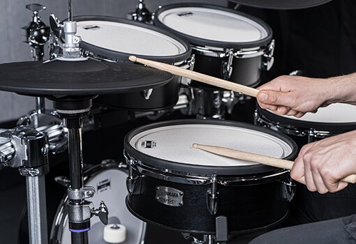 Les peaux maillées utilisent deux plis et sont fabriquées par Remo. Elles offrent une réduction du bruit, une durabilité et une sensation de frappe exceptionnelles, ainsi qu'un excellent rebond, ce qui les rend très confortables à jouer. Les peaux peuvent être réglées en fonction de vos préférences personnelles. Le pad de la caisse claire est équipé de trois capteurs qui répondent avec précision au travail délicat des baguettes.