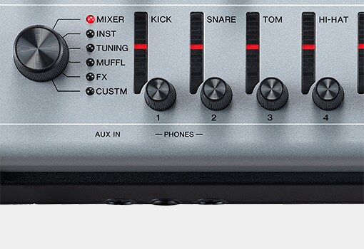 Sept faders rotatifs à LED peuvent être utilisés pour modifier les paramètres de tous les instruments. Avec le bouton de sélection des faders, vous pouvez choisir votre option préférée parmi six présélections (avec 14 sous présélections) et la contrôler intuitivement avec les faders rotatifs à LED.